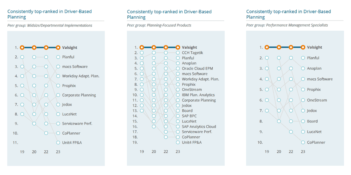 Neben führenden Platzierungen in all seinen Vergleichsgruppen in den KPIs Planning Functionality, Ease of Use, Implementer Support, Vendor Support, Sales Experience, und Competitive Win Rate ist Valsight erneut als führende Lösung für Simulation und Driver-Based Planning ausgezeichnet worden.