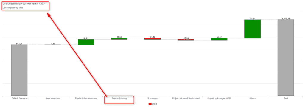 Anschließend lassen sich die simulierten Szenarien in verschiedenen Auswertungsformen analysieren, wie Linien- und Balkendiagrammen oder Tabellen. Um die Auswirkungen einzelner Annahmen auf eine bestimmte Kennzahl zu visualisieren, kann aus einer Vielzahl von Diagrammen gewählt werden. Hier nutzen wir beispielhaft eine Assumption Bridge, welche die Auswirkung der Anpassungen in der Personalplanung auf den Deckungsbeitrag für das Jahr 2018 separat dargestellt. Auf diese Weise wird das Planen von Maßnahmen unter bestimmten Annahmen sehr übersichtlich, einfach und transparent.