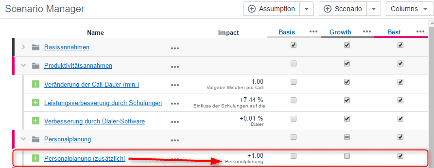 Annahmen können jederzeit mit ein paar Klicks hinzugefügt werden. Jede Annahmengruppe (hier z.B. „Personalplanung“) enthält Unterpositionen (wie hier „Personalplanung (zusätzlich)“), welche die Veränderung einzelner Elemente im Modell beschreiben: